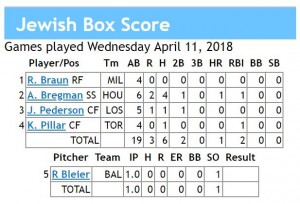 box score 4-11-2018 gamesAlex Bregman had his breakout game of the young season, going 4-for-6 with a double, home run, and an RBI (see video below), but the Houston Astros (9-4) nevertheless lost to the host Minnesota Twins, 9-8.
